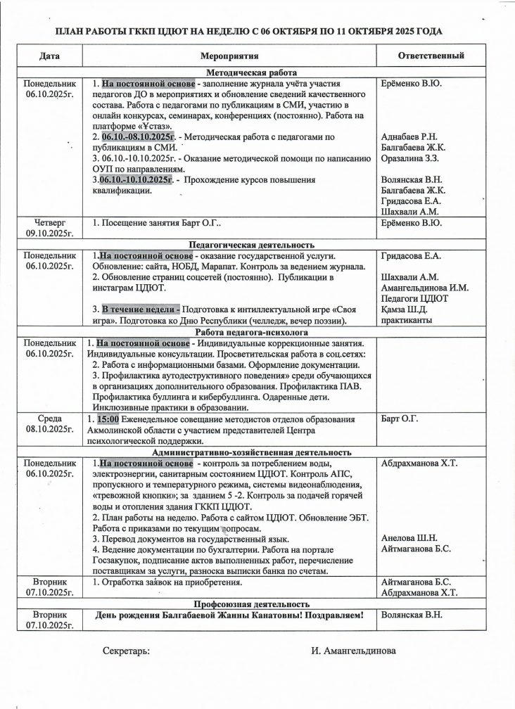 2025 ЖЫЛҒЫ 06-11 ҚАЗАН АРАЛЫҒЫНДАҒЫ АПТАҒА АРНАЛҒАН БЖШО МКҚК ЖҰМЫС ЖОСПАРЫ