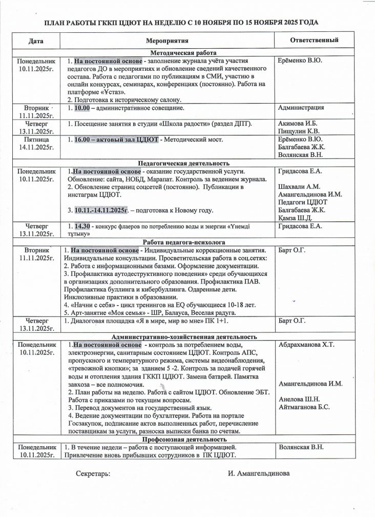 2025 ЖЫЛҒЫ 10 ҚАРАШАДАН 15 ҚАРАШАҒА ДЕЙІН БІР АПТАҒА БЖШО МКҚК ЖҰМЫС ЖОСПАРЫ