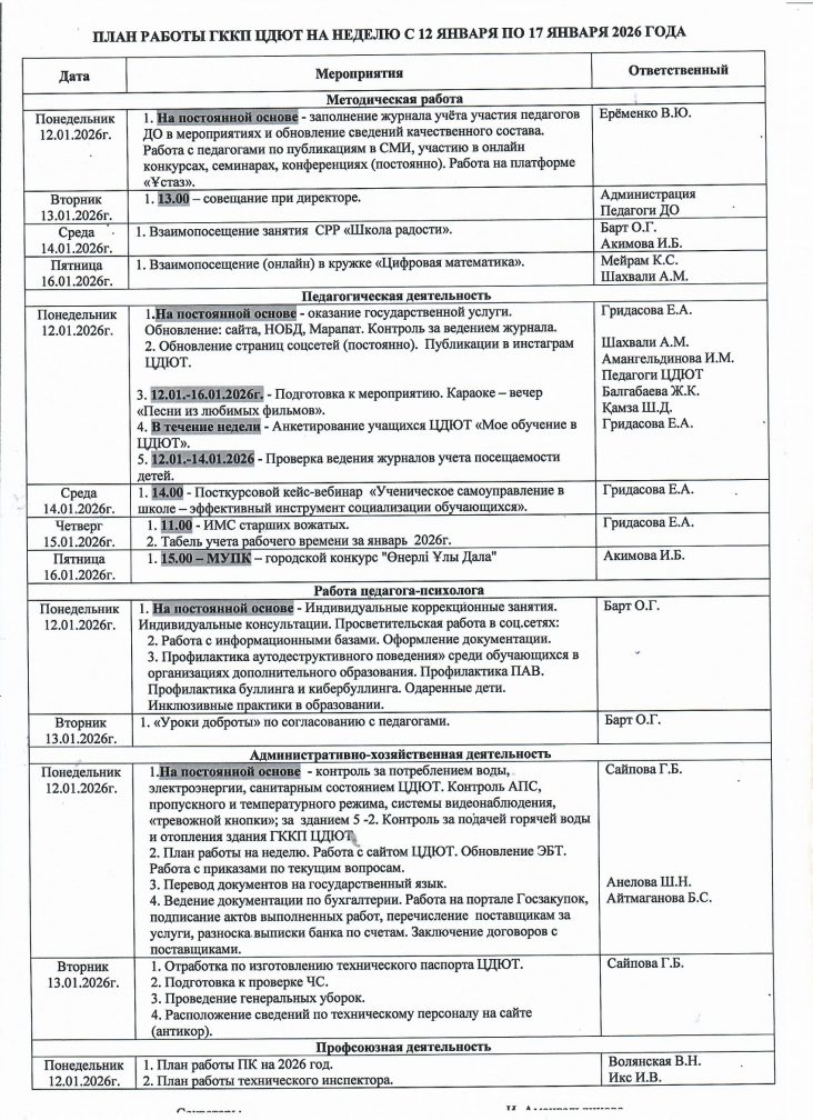 2026 ЖЫЛҒЫ 12 ҚАҢТАР МЕН 17 ҚАҢТАР АРАЛЫҒЫНДАҒЫ АПТАҒА АРНАЛҒАН БЖШО МКҚК ЖҰМЫС ЖОСПАРЫ