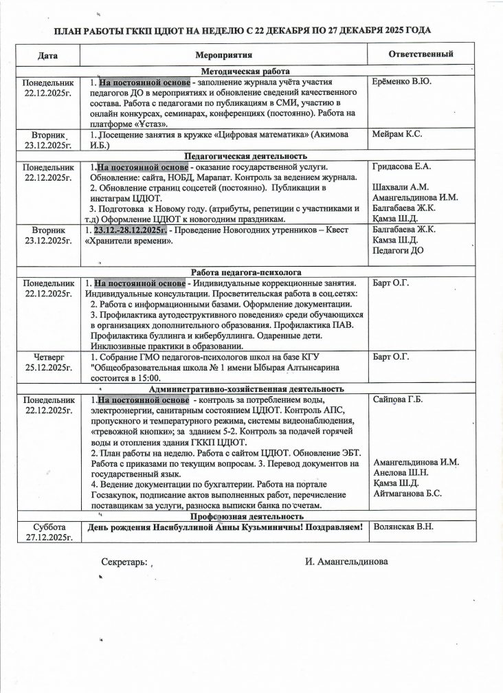 2025 ЖЫЛҒЫ 22 ЖЕЛТОҚСАННАН 27 ЖЕЛТОҚСАНҒА ДЕЙІН БІР АПТАҒА БЖШО МКҚК ЖҰМЫС ЖОСПАРЫ