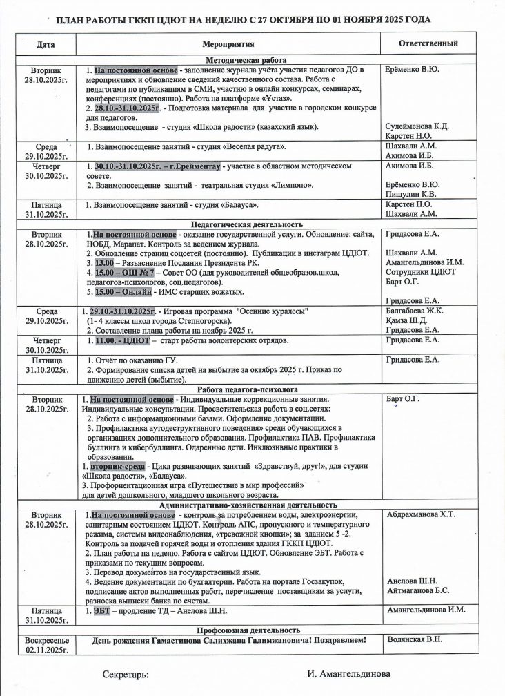 2025 ЖЫЛҒЫ 27 ҚАЗАННАН 01 ҚАРАШАҒА ДЕЙІН БІР АПТАҒА АРНАЛҒАН БЖШО МКҚК ЖҰМЫС ЖОСПАРЫ