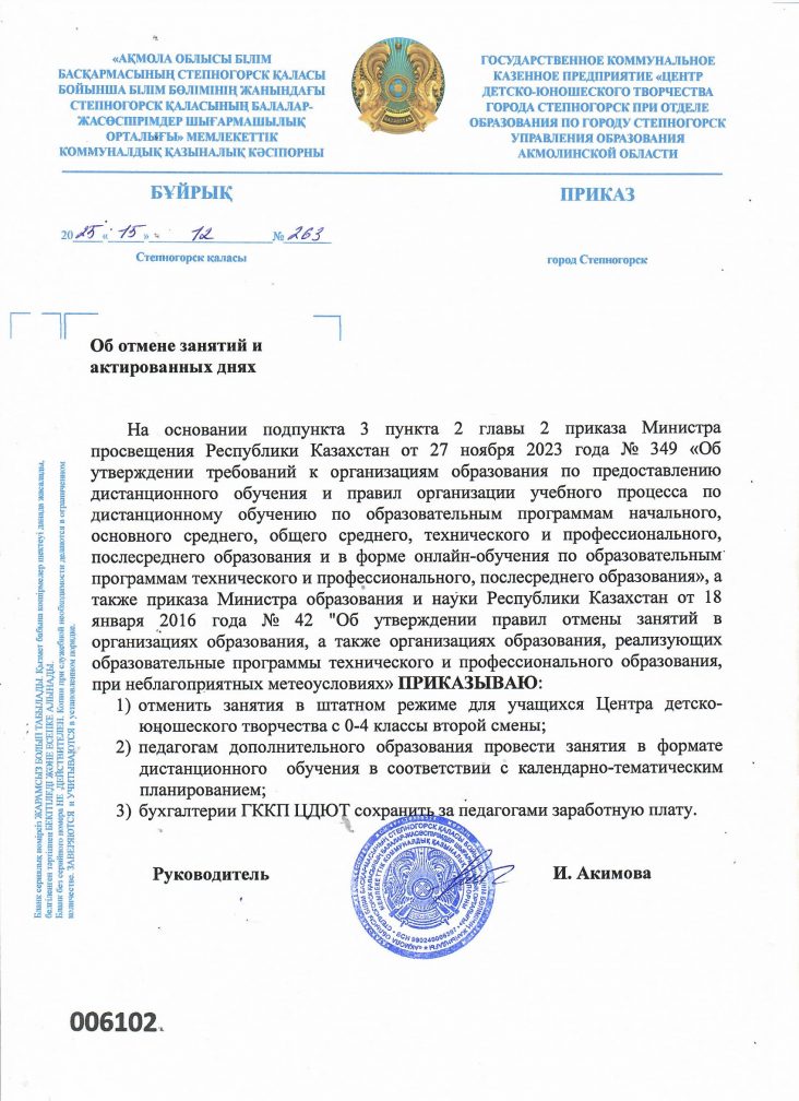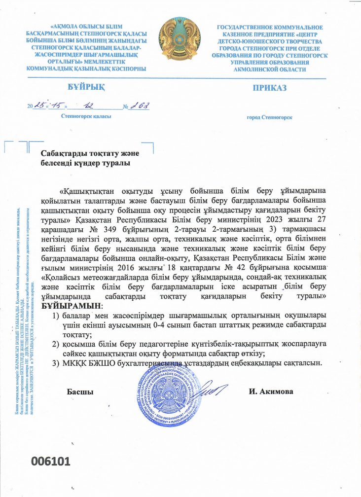 Сабақтарды және актіленген күндерді тоқтату туралы бұйрық. 15.12.2025ж.