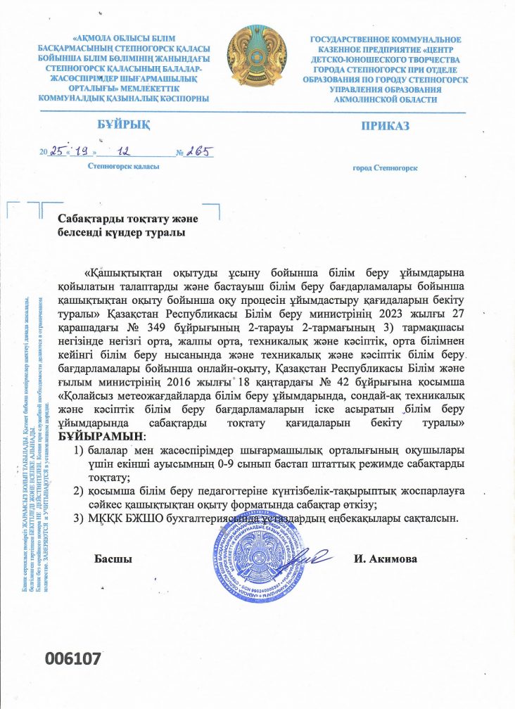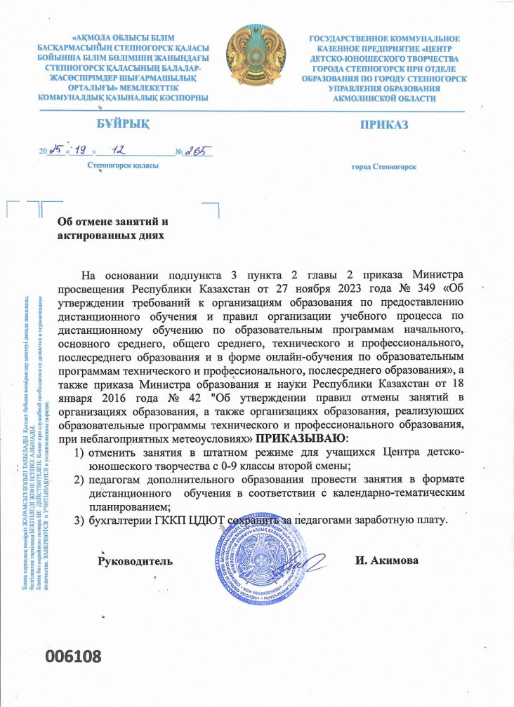 Сабақтарды және актіленген күндерді тоқтату туралы бұйрық. 19.12.2025 ж.