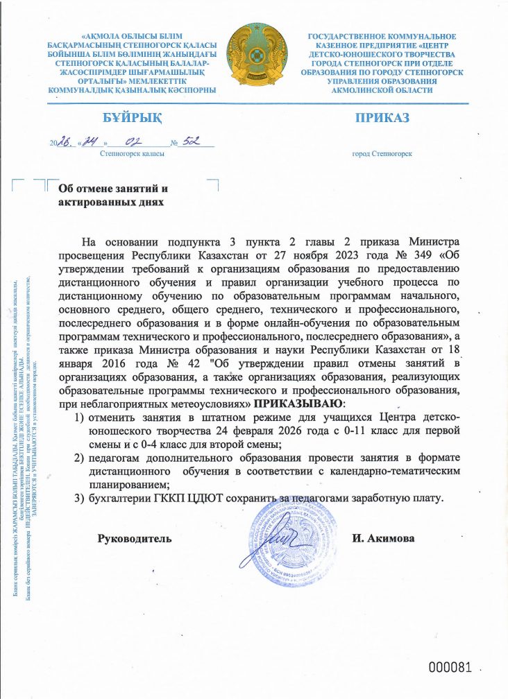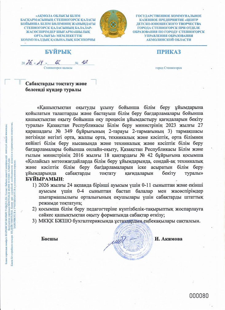 Сабақтарды және актіленген күндерді тоқтату туралы бұйрық-24.02.2026 ж.